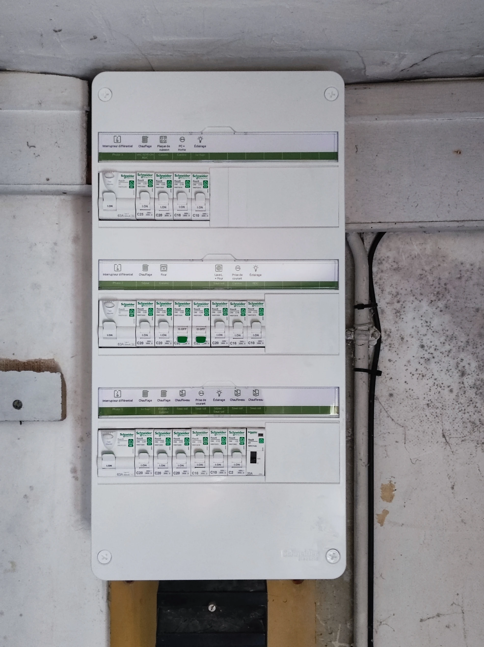 À Charleville-Mézières, remplacement d'un ancien tableau électrique triphasé et équilibrage de phases suite au remplacement des radiateurs électriques par nos soins (modèles Atlantic SOKIO).