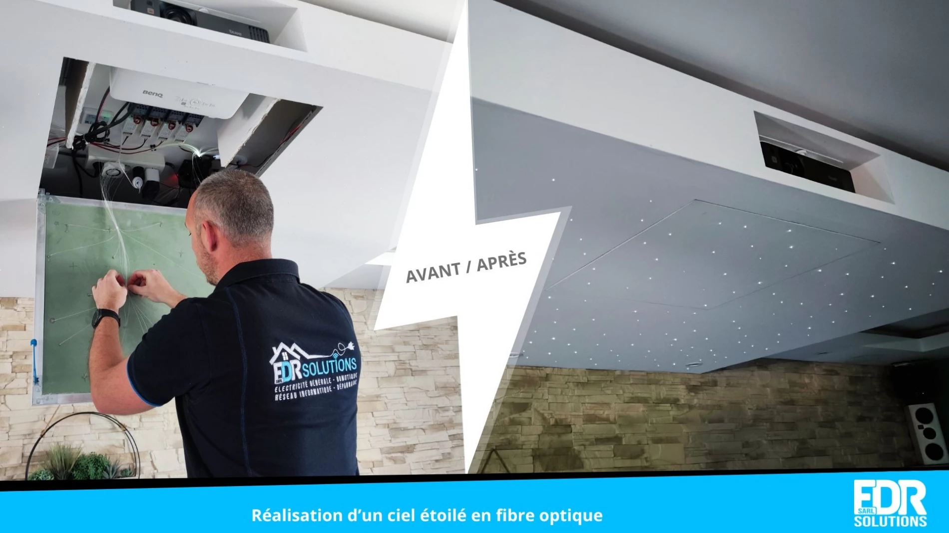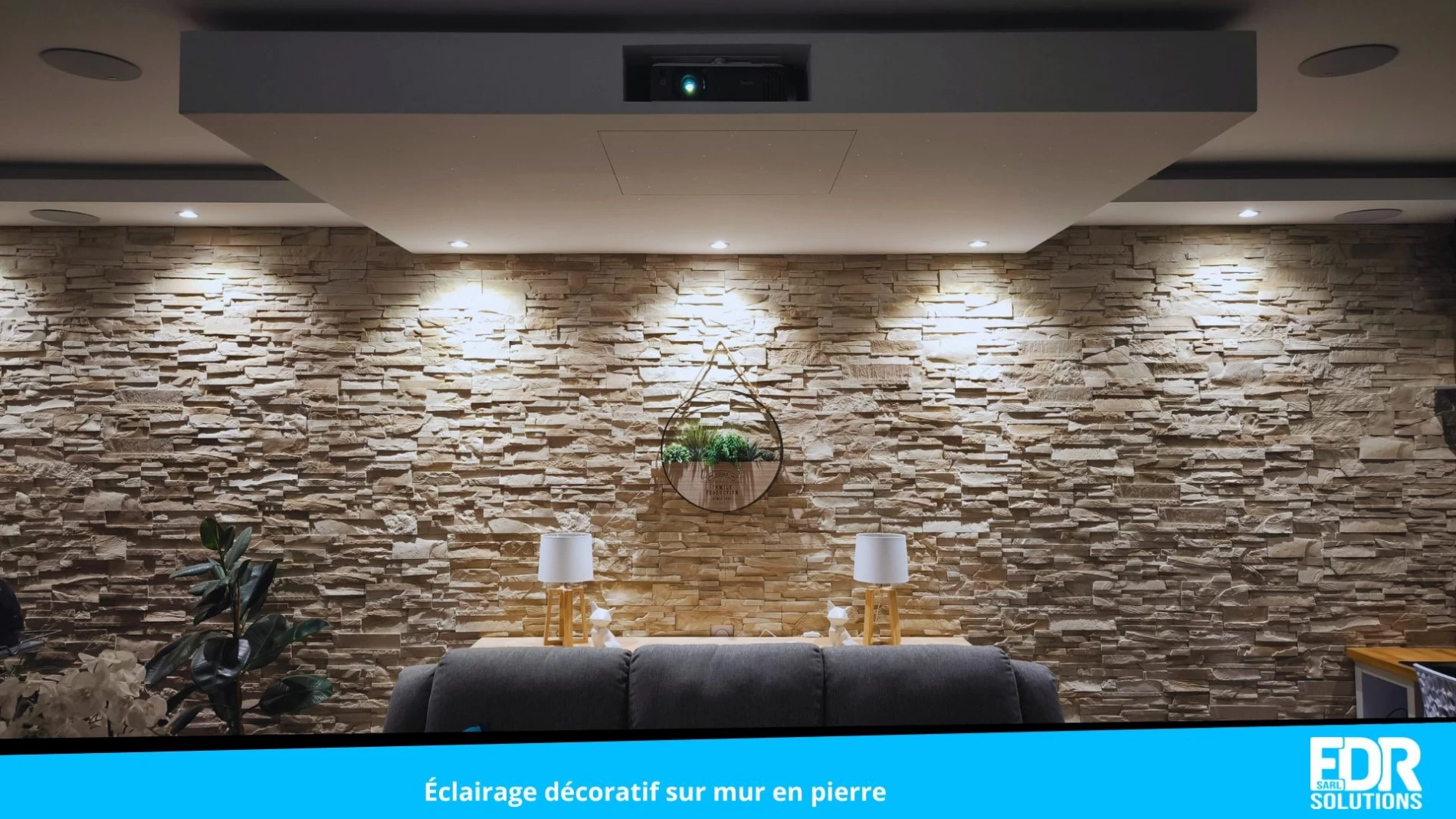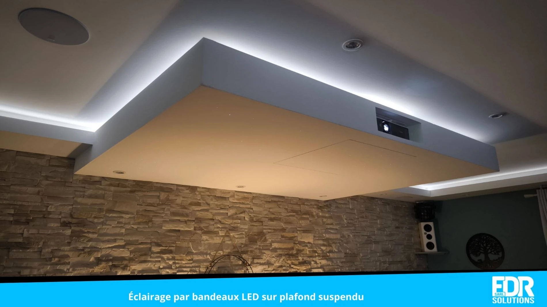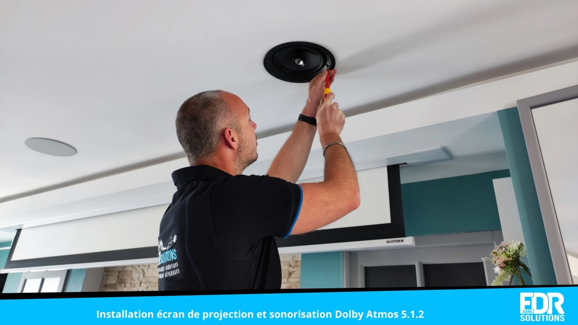 Détails: réalisation d’une salle de cinéma privée comprenant la pose d’un écran motorosé encastrable et d’un vidéoprojecteur, la pose et la mise en service d’un home cinéma 5.1.2 de marque FOCAL et la création d’un scénario cinéma avec action sur l’éclairage, les volets, le vidéoprojecteur et son écran